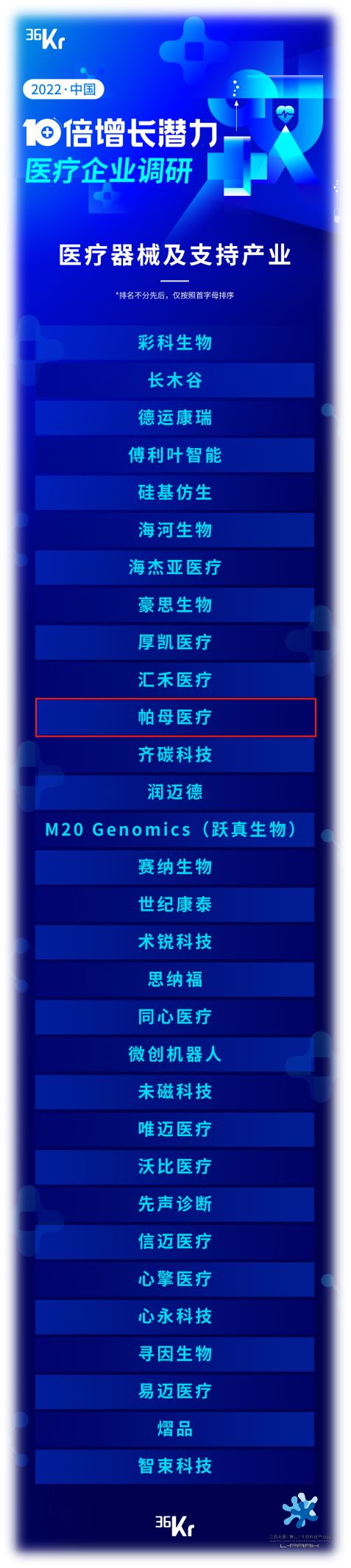 日前,由36氪主導、“2022年中國10倍增長潛力醫療企業”調研結果公布,共100家企業登上生物醫藥及其支持產業、醫療器械及支持產業、數字健康、合成生物四大領域榜單;帕母醫療上榜其中的醫療器械及支持產業類。